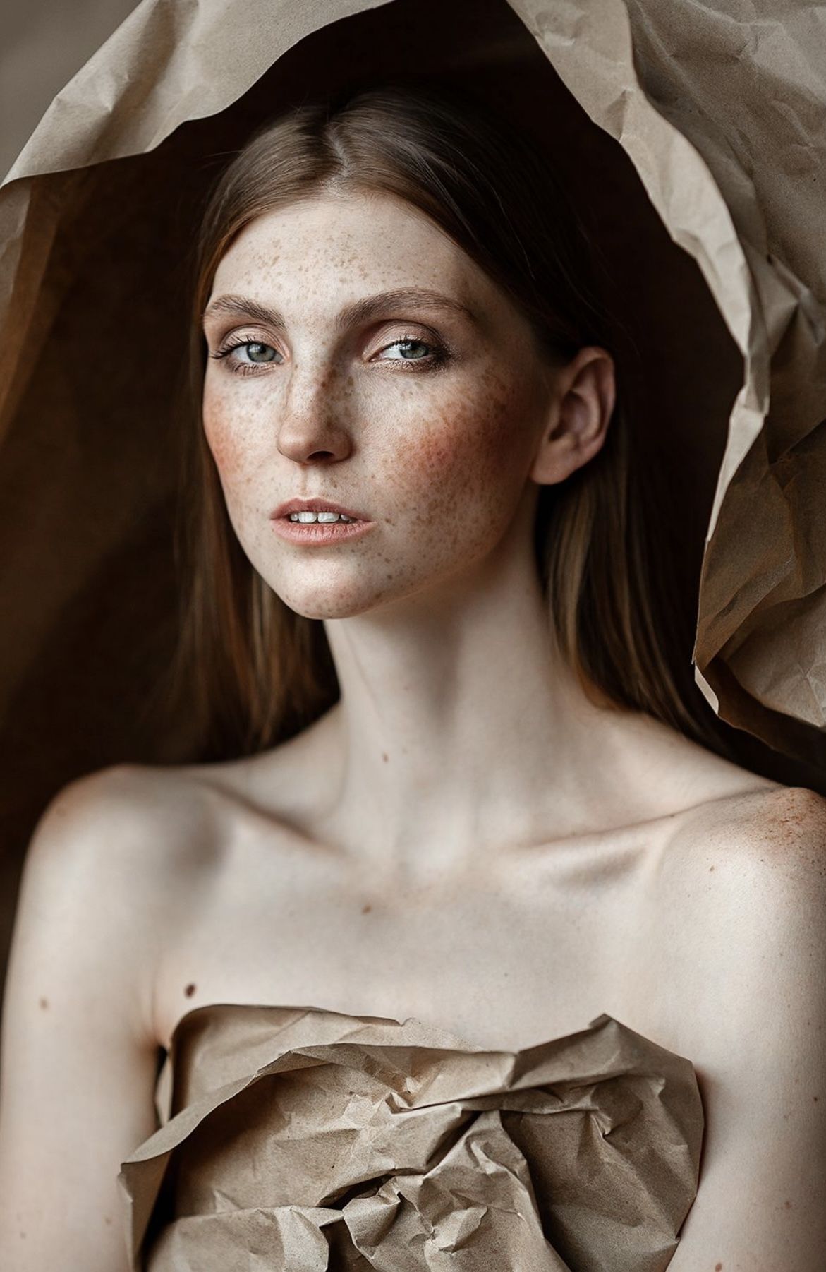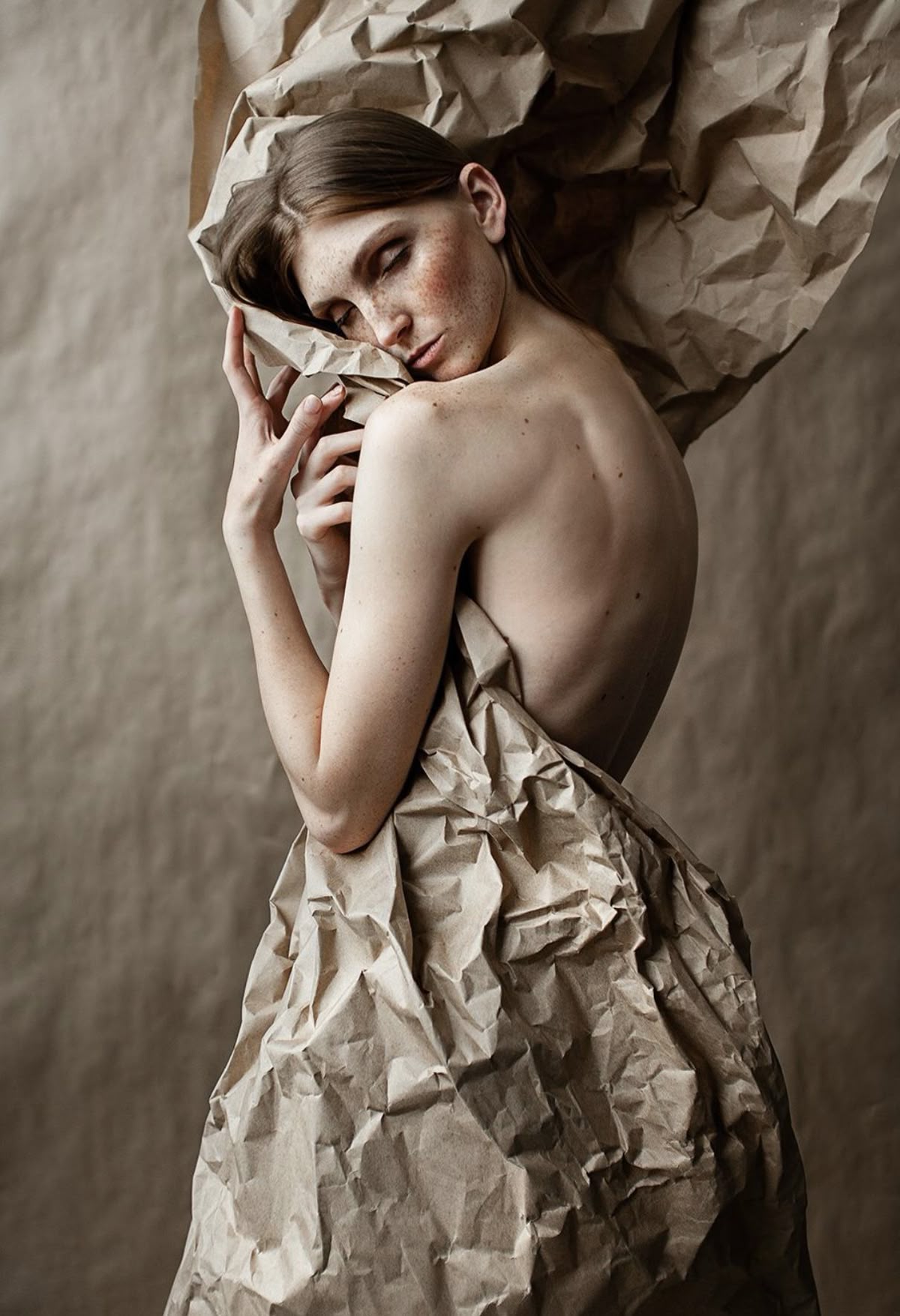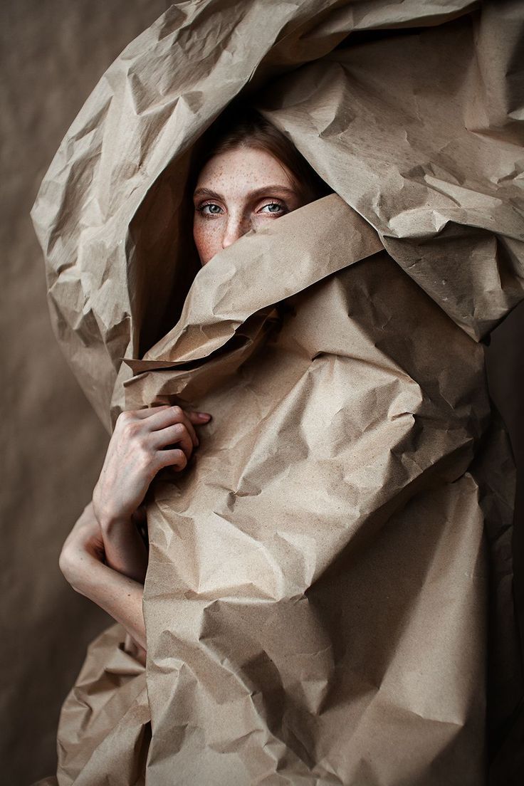 minimalistyczne zdjęcia modelki ubranej w karton